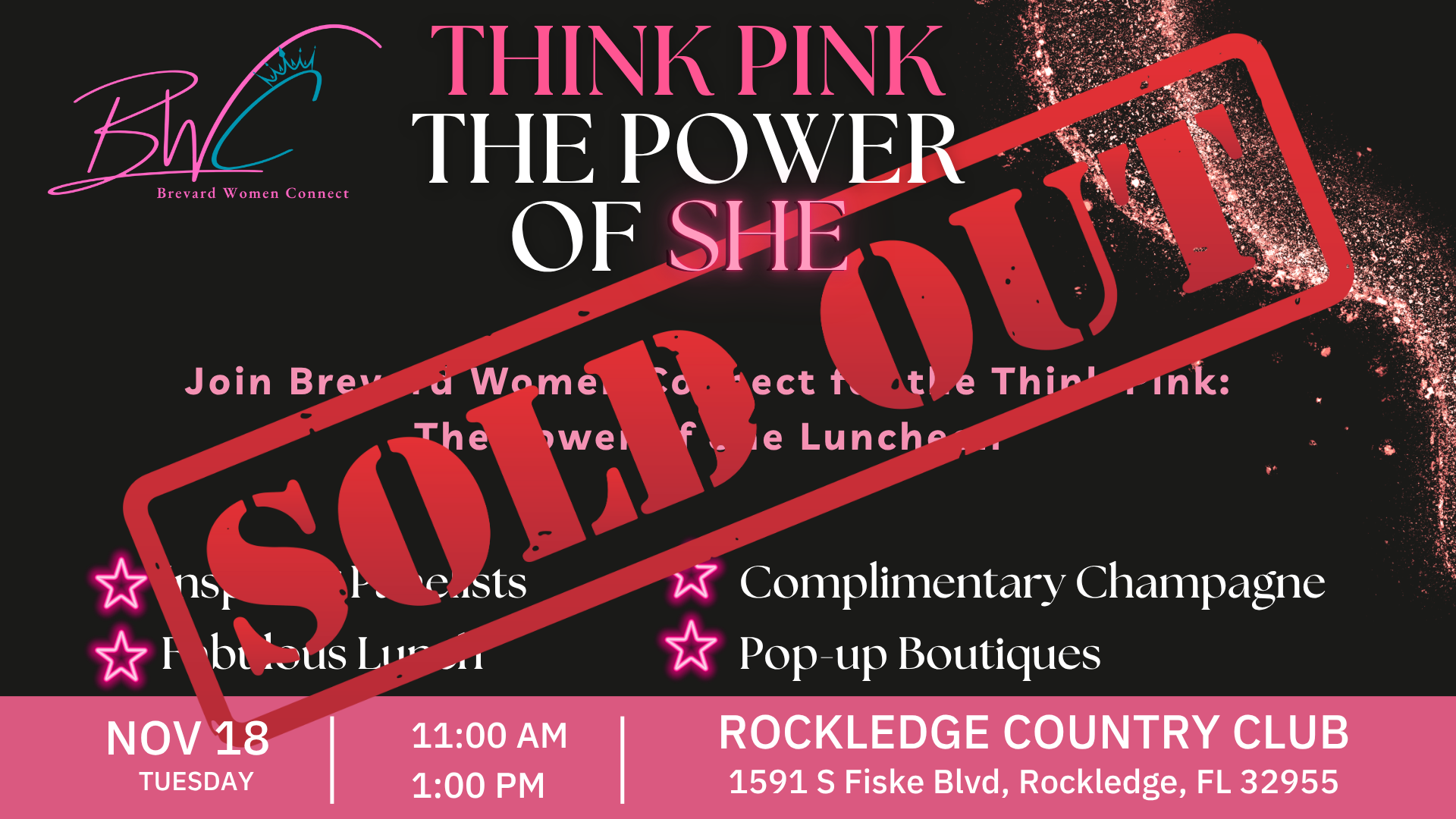 Join Brevard Women Connect for the Think Pink: The Power of She Luncheon on Tuesday, November 18, 2025, at the beautiful Rockledge Country Club! This female-focused event will bring together women from across the Space Coast for an inspiring and empowering experience. It's a perfect opportunity to connect, share, and support each other on our professional journeys. The luncheon will feature inspiring speakers, meaningful discussions, and an atmosphere of collaboration designed to uplift and empower women in all stages of their careers.